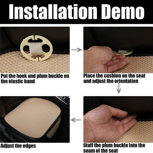 • Easy to Install: First install the two plum buckles, put the cushion on the seat and adjust the direction, plug the plum buckles into the seat gap, the plum buckles can securely stuck the cushion. Finally pull through the metal hook on the elastic strap, fix the hook on the bottom of the seat to complete the installation.