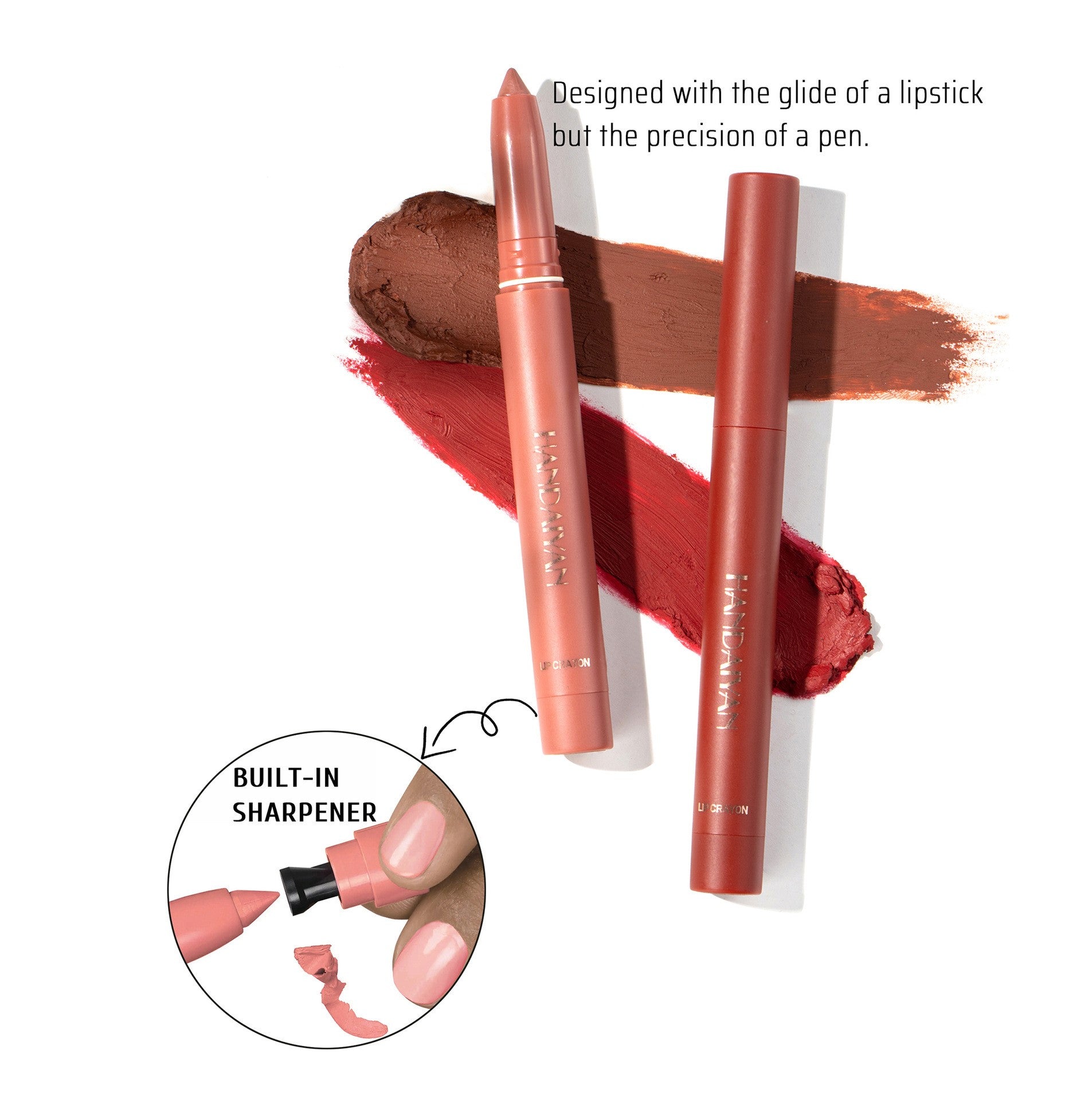 2-in-1 function - both a lip liner and a lipstick, depicting the lip shape while applying color, satisfying all needs. A small design has been added to the bottom, placing the pencil tip on top and gently rotating it to restore the most original tip shape, making it even easier to use!